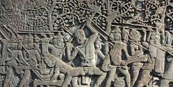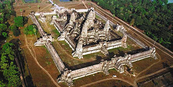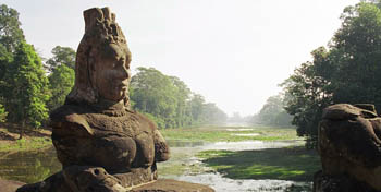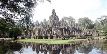 The Angkor Wat Temple, the mysterious Hindu Temple built by King Suryavarman II at the height of the Khmer Empire in the 12th century is the world's largest temple complex. Consists of many sandstone temples, chapels, causeways, terraces and reservoirs, it is believed that the gods assisted the architect whose identity remains a mystery until today. The walls of the temple are covered with thousands of carving depicting scenes of confrontations between the gods and the demons of classical Hindu mythology. Yet on some are genial-dancing ladies known as "Apsara" and on others depicting royal processions with the king and other royalties riding on elephants. Whatever it is, the carvings are clearly masterpieces in the true sense. There is much about Angkor Wat that is unique among the temples of Angkor. The most significant point is its westward orientation. West is symbolically the direction of death, which once led many scholars to conclude that Angkor Wat was primary a tomb. This was supported by the fact that the magnificent bas-reliefs of Angkor Wat were designed to be viewed in an anticlockwise direction, a practice which has antecedents in Hindu funerary rites. Vishnu, however, is often associated with the west , and it is commonly accepted nowadays that Angkor Wat was probably both a temple and a mausoleum for Suryavarman II. ANGKOR THOM