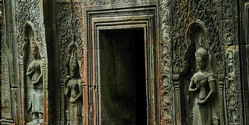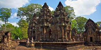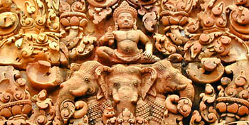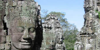 The Bayon takes an easy second places after Angkor Wat. The smile of the four-faced Bayon has become a world-recognized symbol of Cambodia. The towering faces, reaching up to four meters in height, adorn the Bayon Temple at the exact center of Angkor Thom in Siemreap. As many as 216 faces on the 54 remaining towers, each represented one province of Khmer empire in the ancient time. The Bayon is now known to have been built by Jayavarman VII . There is still much mystery associated with the Bayon - its exact function and symbolism - and this seems only appropriate for a monument whose signature is an enigmatically smiling face. BANTEAY SREY :