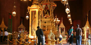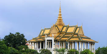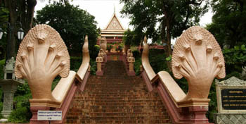 The Silver Pagoda, or the Preach Vihear Preah Keo Morokat (the Emerald Pagoda) to Khmers, lies within the grounds of the Royal Palace, situated near the banks of the Tonle Sap. Originally a wooden structure, the palace was initially constructed in 1892 during the reign of King Norodom, but rebuilt in its present grandeur by King Norodom Sihanouk in 1962. And he spared no effort to make this a true embodiment of the billiance of Khmer art and a rich of an ancient culture. More than 5300, 1.125 kilo silver tiles make up the floor of the Silver Pagoda, giving it its name among foreigners. The silver floor alone weights over 6 tons. The staircase leading into the pagoda is marble, and inside, two breathtaking representations of the Buddha hold court. The Emerald Buddha is, in fact, made of Baccarat Crystal, and dates back to the 17th century. A small glass case nearby enshrines a sacred Buddha relic, brought from Sri Lanka by the Venerable Loeva Em, formerly of Wat Lanka , in 1956. But the second statue of Buddha (Picture on the left) is the one which often catches the eye of visitors the most strongly. Its 90 kilo gold body is studded with 2086 diamonds. The largest , on Buddha's crown, weighs 25 karats. Cast in 1904 by King Sisowath at the request of his elder brother King Norodo, it represents Maitreya Buddha in the Buddhist year 5000 - the future Buddha. WAT PHNOM :