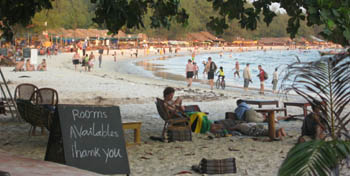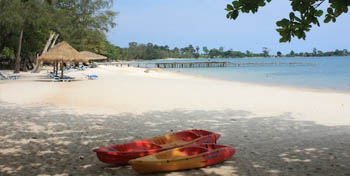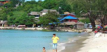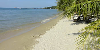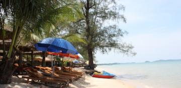 Occupying all of Sokha Beach, the new Sokha Beach Resort, Sihanoukville’s first full resort complex, is offering upscale accommodation restaurants, water sports, and more. Sokha Beach is about 1 Kilometer long and comparatively wide so that there is plenty of sand left during high tide. It is perfectly groomed these days, fairly quiet by comparison to Ochheuteal, and is open to the general public as well as guests of the resort. OTRES BEACH